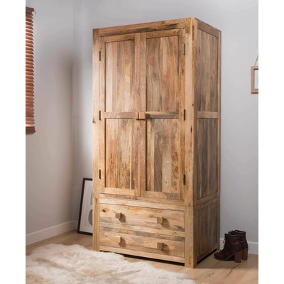 Dvoudvéřová šatní skříň z masivního mangového dřeva má dvě zásuvky a šatní tyč.