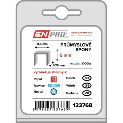 spony PROFI ENPRO velmi kvalitní ocelové spony do sponkovačky typ spon: 53 šíře spon: 11,5 mm síla spon: 0,75 mm výška spon: 6 mm vhodné pro: 123754,123755,123747,123753