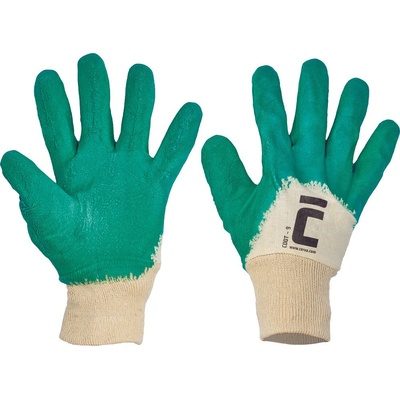 Popis: Rukavice šité z bavlněného úpletu, s protiskluzovým povrchem, pružným nápletem na zápěstí a máčenými dlaněmi a prsty v kaučuku. Materiál: Oblast máčení: latex...