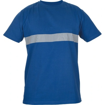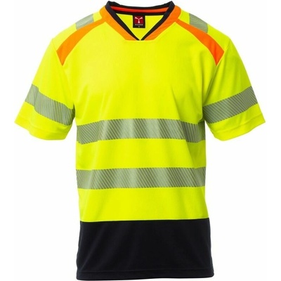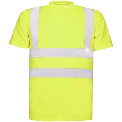 Reflexní tričko s krátkým rukávem a reflexními pruhy: 2 horizontální a 2 vertikální o šířce 5 cm. Tričko má po stranách panely ze síťoviny a kulatý průkrčník v kontrastní tmavě...