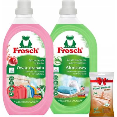 Frosch Sada gelů na praní tkanin obsahuje: - Frosch Gel na praní tkanin Ovoce granátového jablka 1,5L 30pr x1 - Frosch Gel na praní tkanin Aloe vera 1,5L 30pr x1 + Dárek...