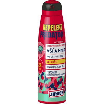 Popis produktu Repelent Predator Junior spray je repelentní pěna pro děti od 3 měsíců a osoby s přecitlivělou pokožkou. Odpuzuje klíšťata, komáry a jiný obtížný hmyz.