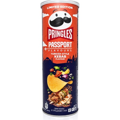 Pringles Passport Turkish Style Kebab 165 g Popis produktu Bramborové lupínky s ochucující směsí s příchutí kebabu inspirovanou tureckou kuchyní. Kombinují typickou křupavost...
