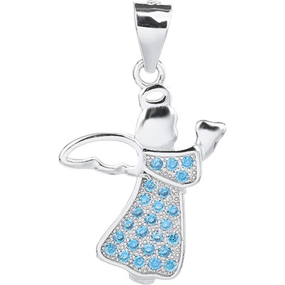 Stříbrný přívěsek anděl je vyrobený z rhodiovaného stříbra a je zdobený světle modrými zirkony. Rozměr přívěsku je 13x19 mm. Celková výška přívěsku s ouškem je 24 mm.