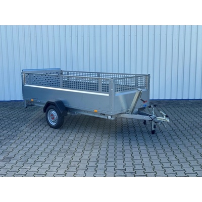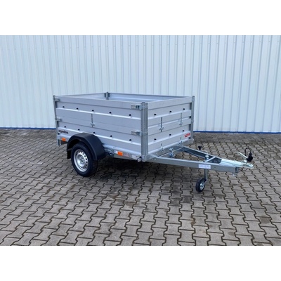 Jednonápravový, nebrzděný valníkový přívěs s koly vedle ložné plochy. Přívěs má hliníkové bočnice o výšce 350 mm a podlahu z voděodolné překližky. Zadní čelo přívěsu je...