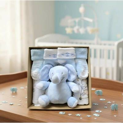 set obsahuje 1x plyšového sloníka cca 20cm - 100% polyester 2x flanelovou plenu s obrázky 70x80 - 100% bavlna 1x bílou tetra plenu LUX 70x80 - 100% bavlna 2x froté ponožečky ...