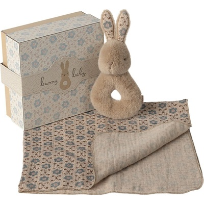 Maileg Dárková sada pro miminko – chrastítko a plenka Rabbit Cream Peach, oranžová barva, béžová barva, textil. Roztomilá sada pro miminko od dánské značky Maileg je ideálním...