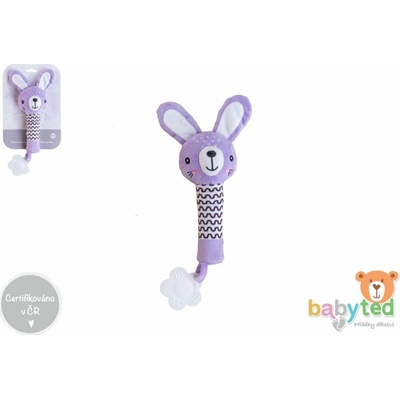 Roztomilý fialový zajíček je ideální první hračka pro miminka již od narození. Díky dlouhému měkkému tělíčku se dobře drží v malých ručičkách a po stisku vydává jemný pískací...
