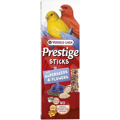 VL Prestige Sticks pro kanáry Superseeds&Flowers 2x30g Doplňkové krmivo od značky Versele-Laga pro kanáry ze semen a květů. Tyčinky plné semínek a květů obohacené o med a...
