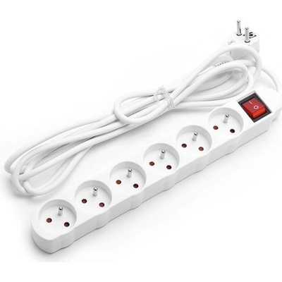 Prodlužovací kabel 5m se 6 zásuvkami s vypínačem prodlužka šňůra bílá barva. Kabel - 3x1.0mm2 Max proud - 16A Napětí - 220-250V ~ Max 2300W IP20 CE, RoHS
