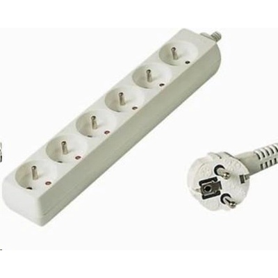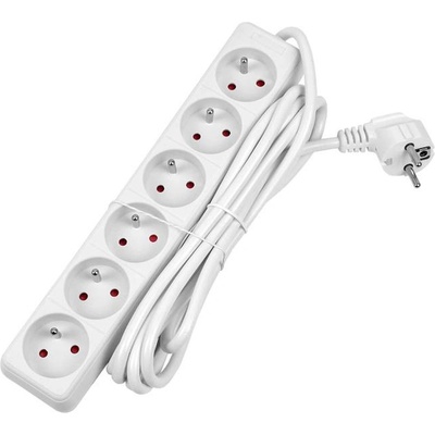 Šestinásobná zásuvka s vypínačem a prodlužovacím kabelem. Zásuvky typ E (české), vidlice typ E/F (univerzální pro zásuvky s ochranným kolíkem nebo bočními kontakty).;...