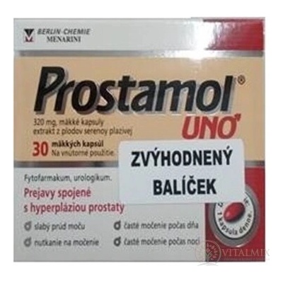 Prostamol UNO je určen pro muže, kteří mají potíže s prostatou. Přípravek se užívá při poruchách močení při nezhoubném zbytnění prostaty (benigní hyperplazii prostaty). Mezi příznaky patří obtížné a bolestivé močení (bolest za stydkou sponou), zpomalené zahájení...