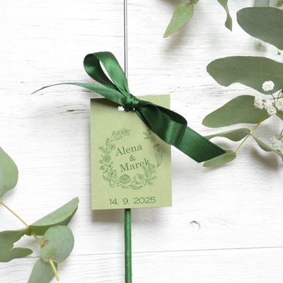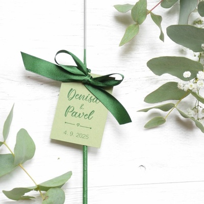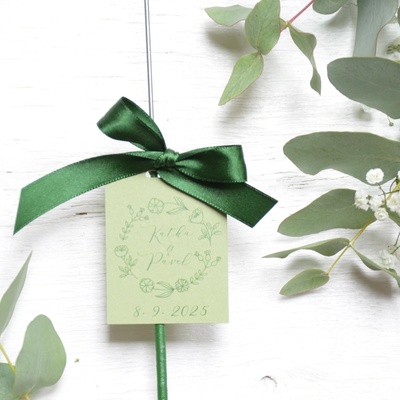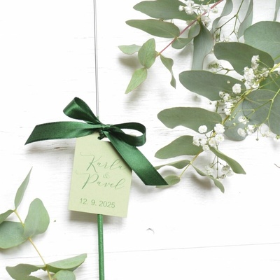 Kartičky na prskavky + stužky + mašličky. Zkompletovaná sada - prskavka 25 ks - kartička s vaším textem - probarvený (oboustranně) zelený karton 300g - zelená stužka -...