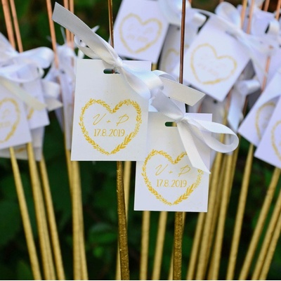 Zlaté svatební prskavky 70cm včetně kartiček balení obsahuje: - počet prskavek v balení: 25ks - kartička s vaším textem (grafiku lze upravit na přání) - standardně bílá...