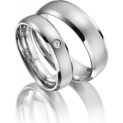 Snubní prsteny z chirurgické oceli. Povrch prstenů v barvě oceli je matný, pozlacená část je leštěná. Dámské prstýnky ve velikostech 49-57 jsou osazené fasovanými zirkony....