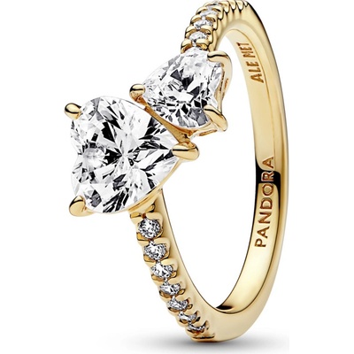 Pozlacený prsten PANDORA se dvěma zirkonovými srdíčky. Zirkony ve tvaru srdce osazené těsně vedle sebe symbolizují vzájemnou blízkost dvou milujících se lidí. Oslnivá a...