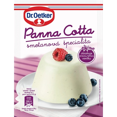 Dr. Oetker Panna Cotta s vanilkou 50g Dopřejte sobě, své rodině a přátelům mimořádný chuťový zážitek.Vychutnejte si lahodný jemný smetanový dezert s pravou vanilkou podle...