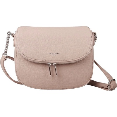 Krásná malá pudrově růžová crossbody kabelka David Jones s výraznými stříbrnými zipy a logem na čelní straně. Kabelka se uzavírá přehoditelnou klopou, která je uchycena ke...