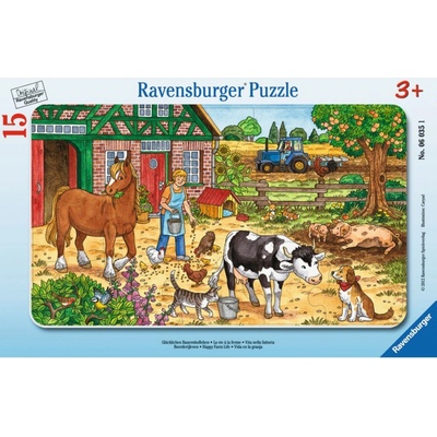 Dětské deskové puzzle (dílky se skládají přímo na přiloženou podložku s rámečkem) s obrázkem statku. Doporučeno pro děti od 3 let. Rozměr složeného puzzle cca 25 x 14,5...