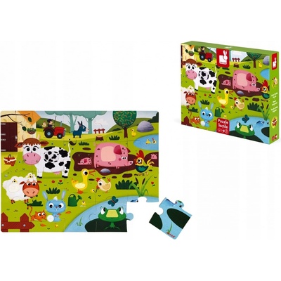 Dětské puzzle JANOD s motivem zvířátek na farmě. Některé dílky mají speciální povrchovou úpravu - texturu, která je charakteristická i pro reálné zvířata. Puzzle rozvíjejí...