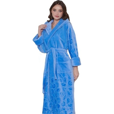 Modrý luxusní dlouhý župan pro ženu z extra froté MOŘSKÝ SVĚT A MUŠLIČKY Prémiový dámský župan je velice kvalitní z jemné teplé silné froté 100% bavlny s hlubokou kapucí, který...