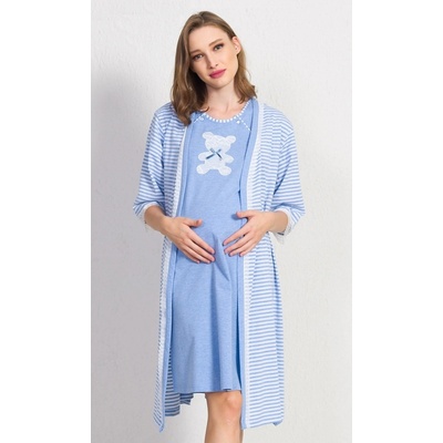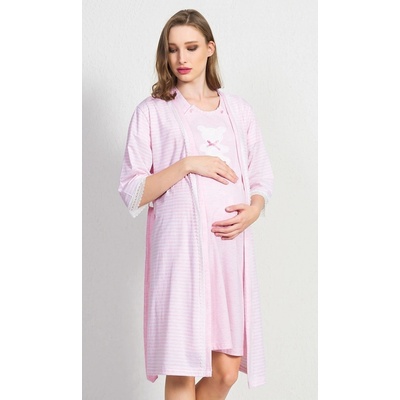 Mateřský komplet - košile a župan - Můj medvídek. Oboustranně rozepínaná kojící košile, mezi rozepínaním je našitý krajkový medvídek, se skutečnou mašličkou pod krkem. Pruhovaný...