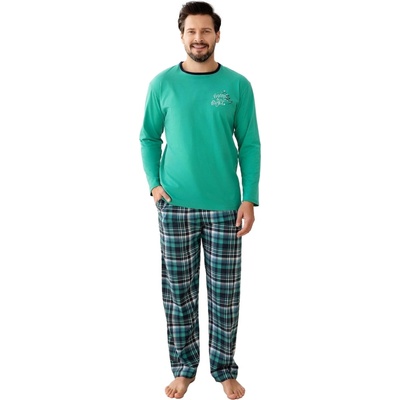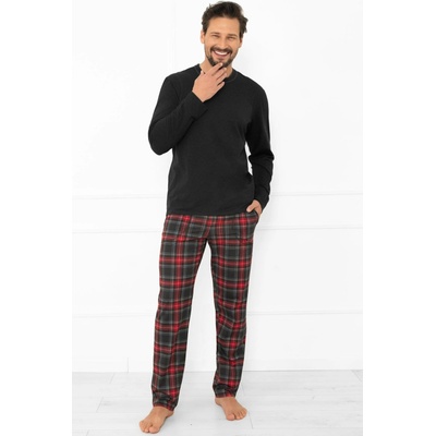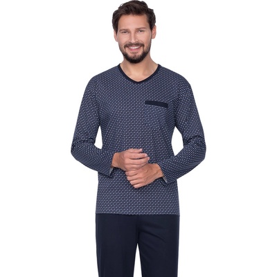 Pánské vzorované pyžamo s dlouhým rukávem a jednobarevnými kalhotami. Vzorované tričko je s dlouhým rukávem a má malou kapsu na prsou. Jednobarevné kalhoty jsou šité bez kapes...