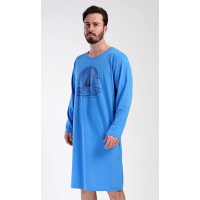 Pánská bavlněná noční košile s dlouhým rukávem Jachting. Jednobarevná pánská noční košile s kulatým výstřihem a délkou po kolena má na hrudi obrázek plachetnice a nápis 'Cape...