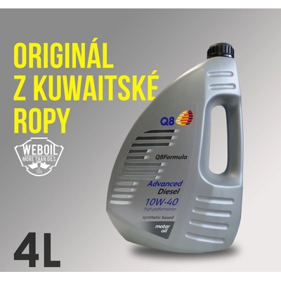 Motorový olej Q8 FORMULA ADVANCED DIESEL 10W40 je částečně syntetický motorový olej pro celoroční provoz v moderních naftových motorech s nebo bez turbodmychadla. Specifikace:...