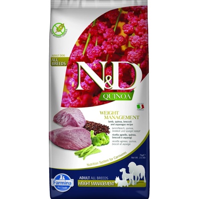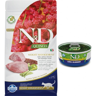 Farmina N&D cat Quinoa Weight Management - Jehněčí maso, quinoa, brokolice a chřest. Kompletní krmivo pro dospělé kočky se sklony k přibírání a nadváze. Složení: Jehněčí maso...