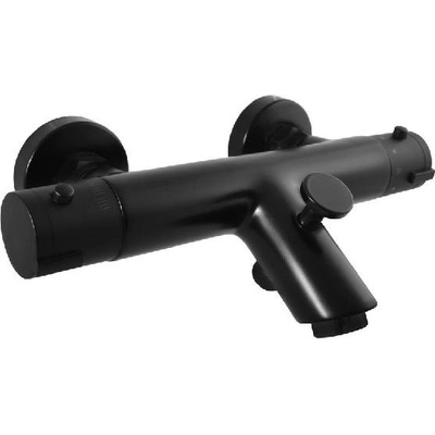 Termostatická nástěnná vanová baterie bez výpusti. V oblém designu. V černé barvě. Rozteč baterie 150 mm. S matným povrchem.