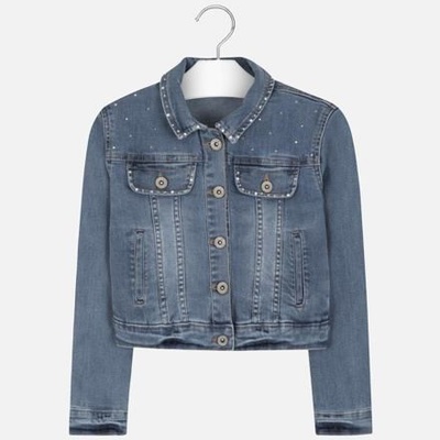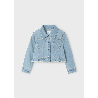 Mayoral dívčí riflová bunda s límečkem a volánkem. Bunda je z velmi příjemné, odlehčené rifloviny. Bunda má zapínání na cvoky, na přední straně jsou 2 funkční kapsy.