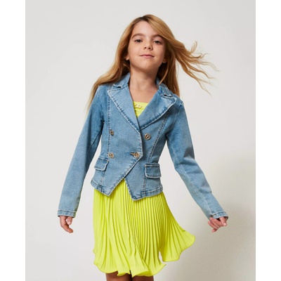 Luxusní dívčí riflové sako se zlatými knoflíky. Bunda má zapínání na přední straně, stejně tak dvě kapsy. U krku má bunda klopy. Bunda je z velmi příjemné, pružné rifloviny.