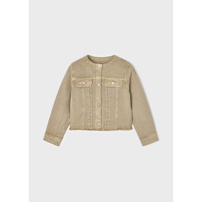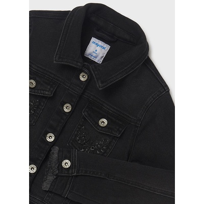 Mayoral dívčí vypasovaná riflová bunda s třepením. Bunda má na přední straně zapínání na knoflíky. Nad levou kapsou na přední straně je aplikace. Riflovina je velice příjemná, odlehčená a pružná.
