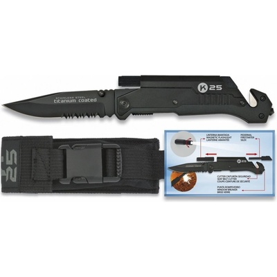 Záchranář s asistovaným otevíráním Mohutný zavírací nůž od španělské firmy K25 z modelové řady PT-109, který je opatřen záchranářskými prvky a systémem asistovaného otevírání....
