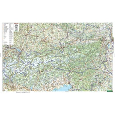 Nástěnná silniční mapa Rakouska - v mapě je podrobně vyznačena silniční síť s čísly silnic, vzdálenostmi v km, - letiště, turistické zajímavosti, hraniční přechody, železniční...