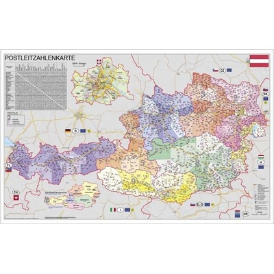 Nástěnná mapa Rakouska s poštovními směrovacími čísly.