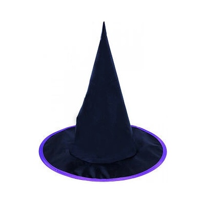 Čarodějnický klobouk nesmí chybět ve tvé karnevalové sbírce! Klobouk je vyroben z černé šusťákoviny a je dekorován fialovým lemem.