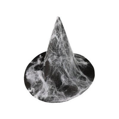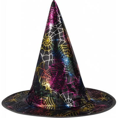 Kouzelný klobouk černé barvy zdoben barevnými magickými pavučinkami. Tento klobouk je určen pro dospělé a je ideální na čarodějnickou nebo halloweenskou oslavu.