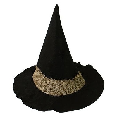 Čarodějnický klobouk je určen pro dospělé. Klobouk černé barvy je dekorován pruhem z pytloviny. Perfektní doplněk na Halloween párty nebo karneval!