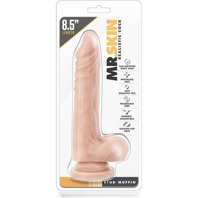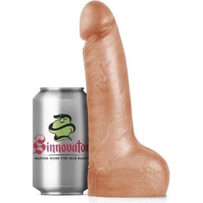 Dildo v tělové barvě s přísavnou, s úzkým obnaženým žaludem, varlaty a žilkováním na povrchu.