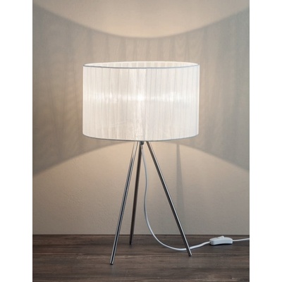 Stolní lampička pochází z řady TRIO. Stínítko lampičky je vyrobeno z překládaných textilních proužků v bílé barvě. Konstrukce je zhotovena z kovu v barvě saténového niklu....