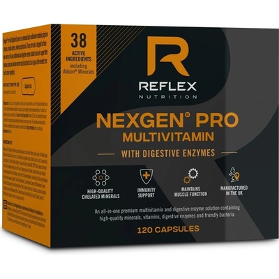 Reflex Nutrition Nexgen PRO + Digestive Enzymes120 + 30 kapslíPrémiový all-in-one multivitamin s obsahem bioaktivních forem vitamínů, organicky vázaných minerálů, bioaktivních enzymů, živých probiotických kultur a rostlinných extraktů = 38 biologicky aktivních složek v...