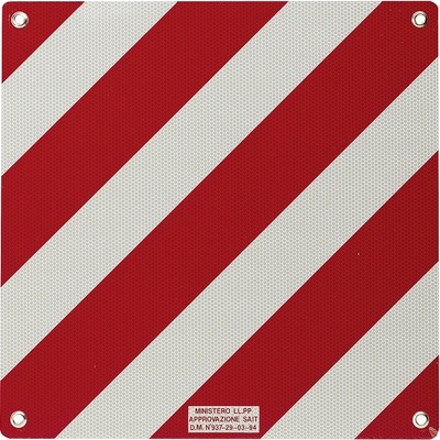 Reflexní tabule - označení nákladu Itálie Tato hliníková reflexní cedule je povinná v Itálii pro označení vozidla v případě, že náklad přesahuje jeho obrys. Využívá se tedy především k označení nosičů kol montovaných na zadní dveře automobilu a na tažné zařízení. V...