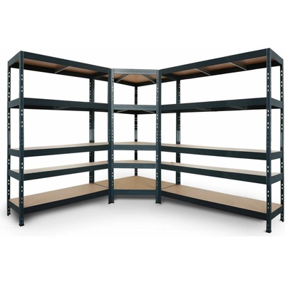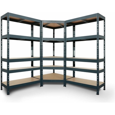 Kompletní kovový regálový systém Corner Pack v antracitové šedé barvě s jemnou strukturou se skládá z rohového policového regálu o rozměrech 180x90x45x64,5cm s 5 HDF policemi se zátěží 250 kg na polici a dvou zásuvných bezšroubových kovových regálů RIVET 180x90x45cm...