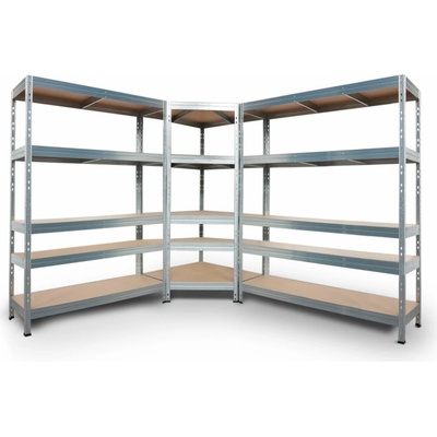 Kompletní kovový regálový systém Corner Pack v zinkové povrchové úpravě se skládá z rohového policového regálu o rozměrech 180x90x45x64,5cm s 5 HDF policemi se zátěží 250 kg na polici a dvou zásuvných bezšroubových kovových regálů RIVET různých šířek, ale stejné...