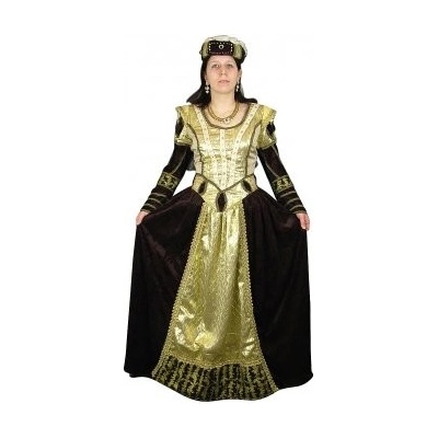 Italské renesanční šaty části kostýmu: šaty, čepec materiál: dekorativní brokát (lehká avšak pevná hustě tkaná látka, odolná vůči zátrhům a prodření, složení 70% PES, 30% kovového vlákna), umělý samet (80% PES,10% bavlny 10% elastanu), zlatá porta Tyto Italské...