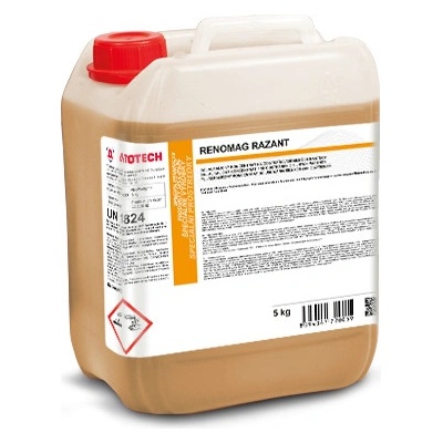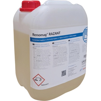 Renomag® RAZANT, 5 kg je silně alkalický prostředek určený pro odmašťování, vhodný zejména pro čištění mřížek digestoří. Razantně rozpouští silné nečistoty a mastnoty z povrchů. Není použitelný na hliník a barevné kovy. Dávkování20 ml/l AplikaceDo roztoku přípravku a...