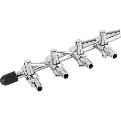 Nerezová rozvodnice pro větvení rozvodů vzduchu v provedení s neobyčejně jemnou regulací množství procházejícího vzduchu prostřednictvím vestavěných kohoutů. - Počet vývodů: 4 - Průměr: 5 mm