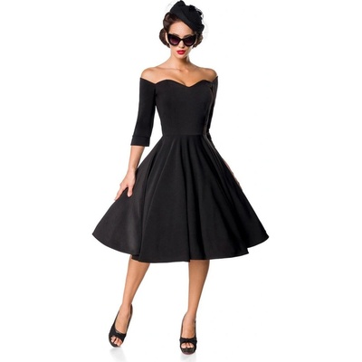 Elegantní černé společenské šaty retro styl 3/4 rukáv výstřih Carmen do písmene V ozdobný pásek, který lze odejmout kolová bohatá sukně vhodné doplnit o spodničku na zadním díle zapínání na skrytý zip délka ke kolenům jemně elastický materiál vhodné k různým...
